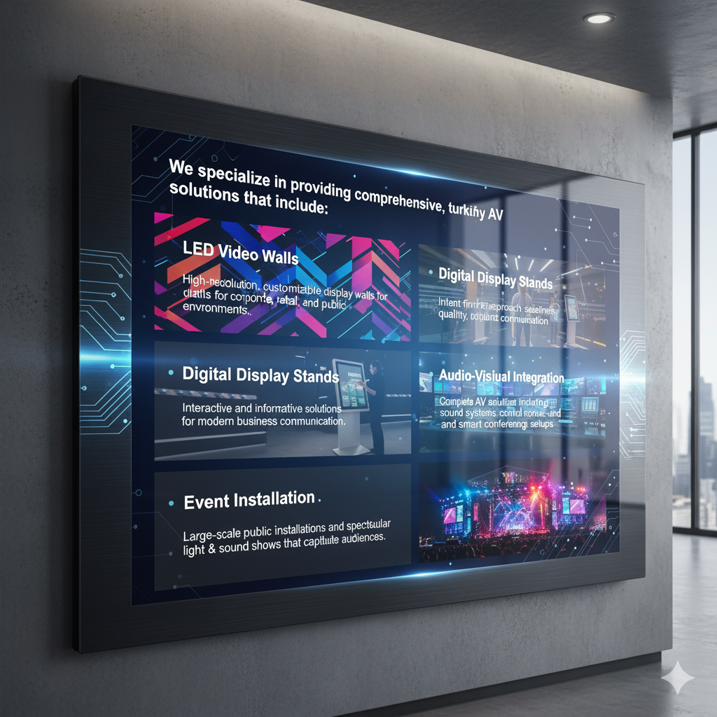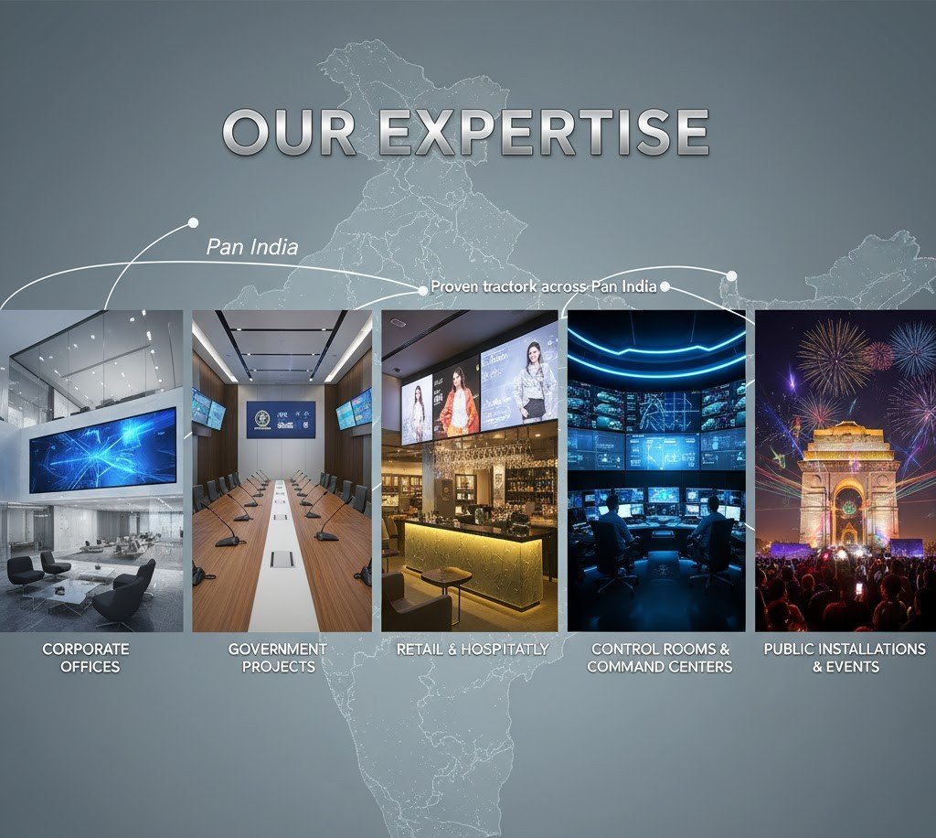 Complete AV ecosystems including LED displays, projection systems, 3D mapping, digital signage, premium sound systems, control rooms, and smart conferencing solutions — seamlessly designed and integrated.
